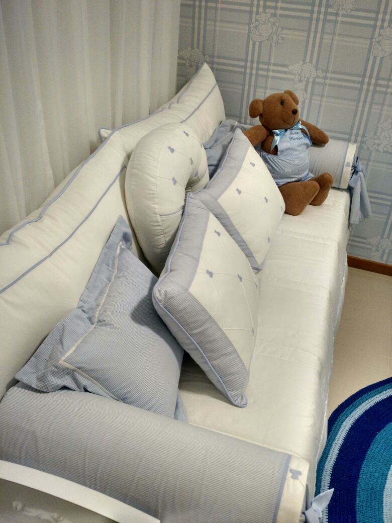 Para o conforto do Pedro Henrique e suporte da mamãe aqui e quem sabe do papai, o porta fraldas e o kit de higiene ficam à mão! Em cima da prateleira Nossa Senhora Aparecida para proteger nosso príncipe presente da vovó, o nome dele em MDF e um urso com o laço do tecido das roupas de cama, e na cômoda tem bandeja espelhada "luxuosa" com um kit higiene de porcelana e ursinhos dourado para guardar as pequenas coisinhas do bebê, dividem o espaço com lindos ursos, coloquei também um verdinho junto a bandeja para dar uma vida aquele espaço! O arremate fica por conta das toalhinhas e do tapete de crochê que a vovó Eliane fez e o vovô Olímpio planejou as medidas e a alternância das cores em tons de azul, muito gostoso, contrastando com os móveis! Uma mesinha que serve de suporte para a mamãe ao lado da cama de babá!